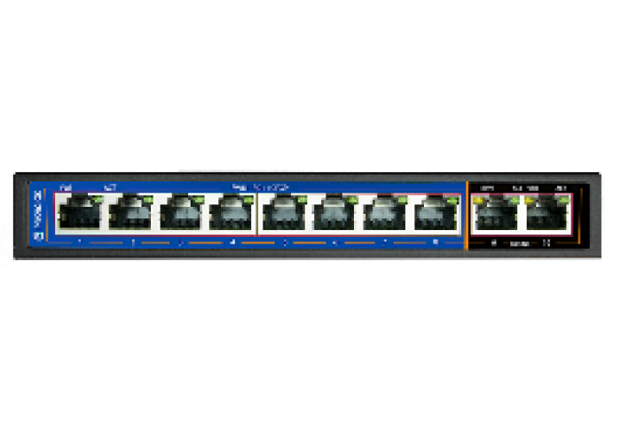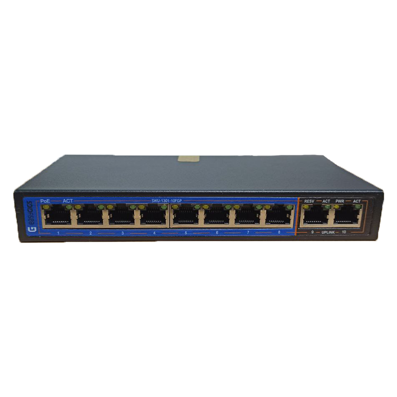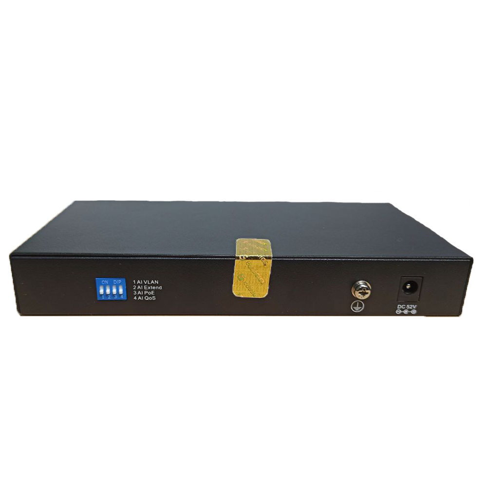 EG-SWU-1301-10FGP is a Gigabit uplink 8-port 100M PoE switch, it has three working modes, It has 4 working modes, AI VLAN mode, AI Extend video monitoring mode, AI PoE mode, AI QoS mode. All ports are free to communicate by default; In AI VLAN mode, 1 -8ports are isolated from each other, which can effectively restrain network storms and improve network performance. In AI Extend mode, the effective transmission distance of 1-8 ports can reach 250 meters, which is suitable for remote monitoring and power supply. In the AI power supply mode, the switch automatically detects the working status of the PD device and finds that the device abnormal automatically restarts the device. In AI QoS mode: the video data will be processed preferentially when the device is congested to make the video smoother EG-SWU-1301-10FGP supports the standard IEEE 802.3 af/at protocol, which can automatically detect and identify the PD devices and supply power, therefore, Don not worry about PoE or non-PoE devices that can damage private standards.